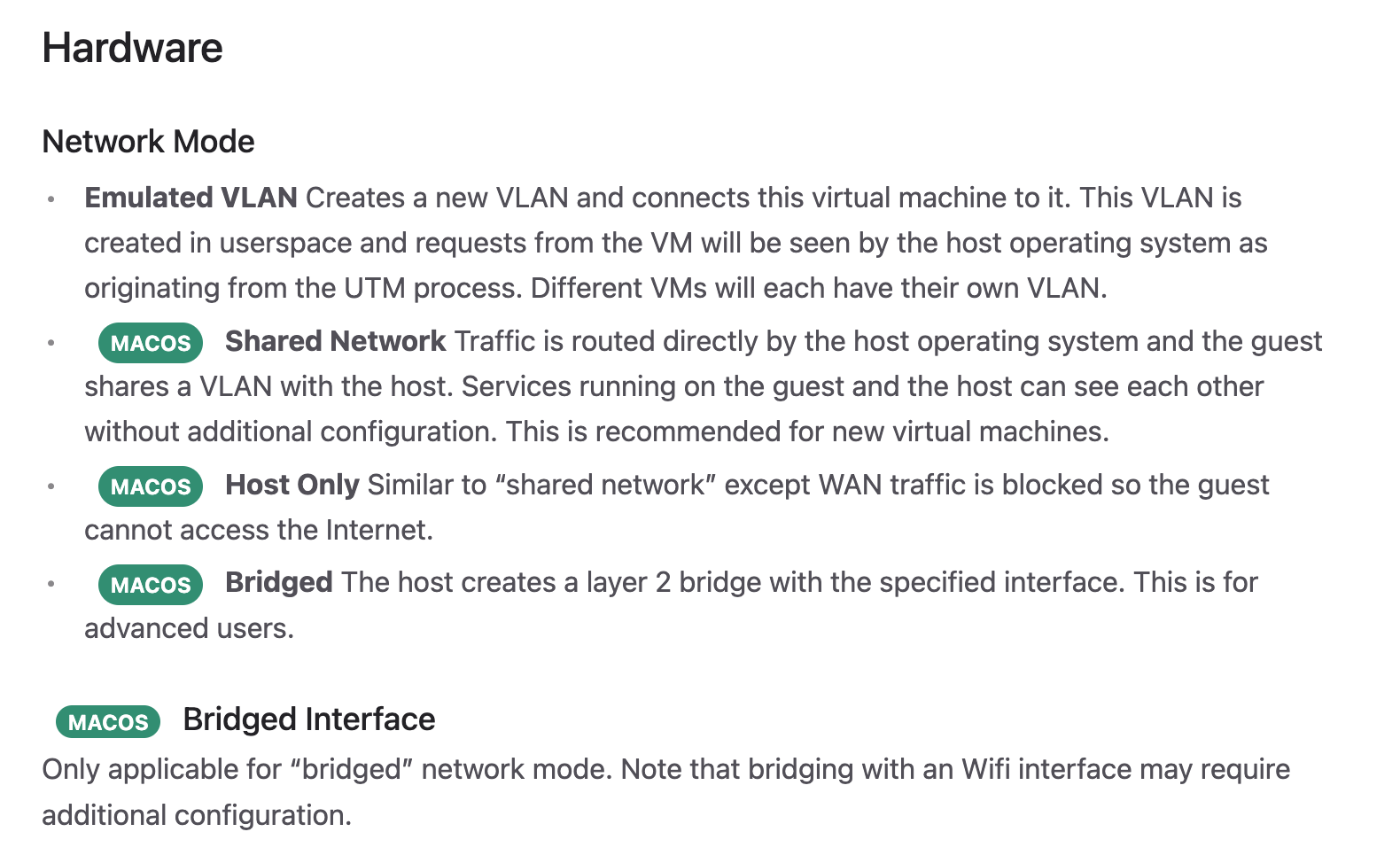 이번 포스팅에서는 UTM에서는 어떤식으로 VM과 로컬의 네트워크가 연결되어있는지와 UTM에서 사용하는 네트워크 옵션들을 살펴보려한다.